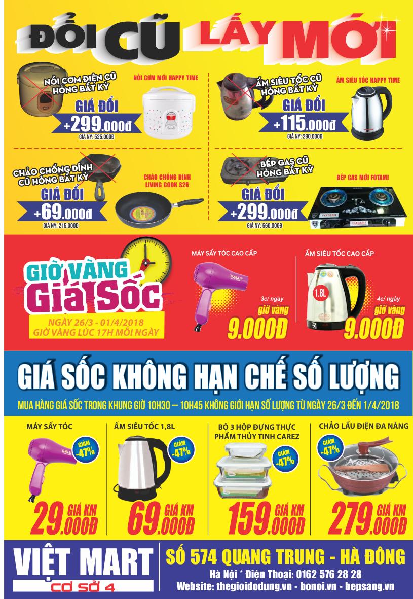 Đổi cũ lấy mới với giá sốc không hạn chế số lượng. Ngoài ra còn có mua hàng giá sốc vào khung giờ vàng 10h30-10h45 không hạn chế số lượng từ 26/3/2018-1/4/2018